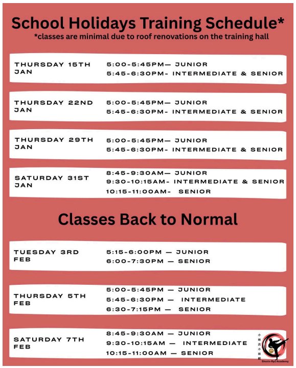 | Tuesday | 5:15pm to 6pm | Junior Belts |